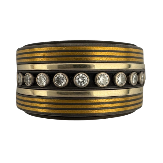 Titanium liner with outside titanium bands pin striped with 24K gold, (2)gold bands and a center band of titanium set with (24)diamonds