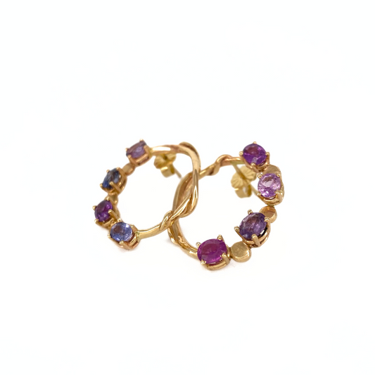 14k Oval Yellow Gold Post Earrings with Half Ring of 4 Pink and Purple Sapphires