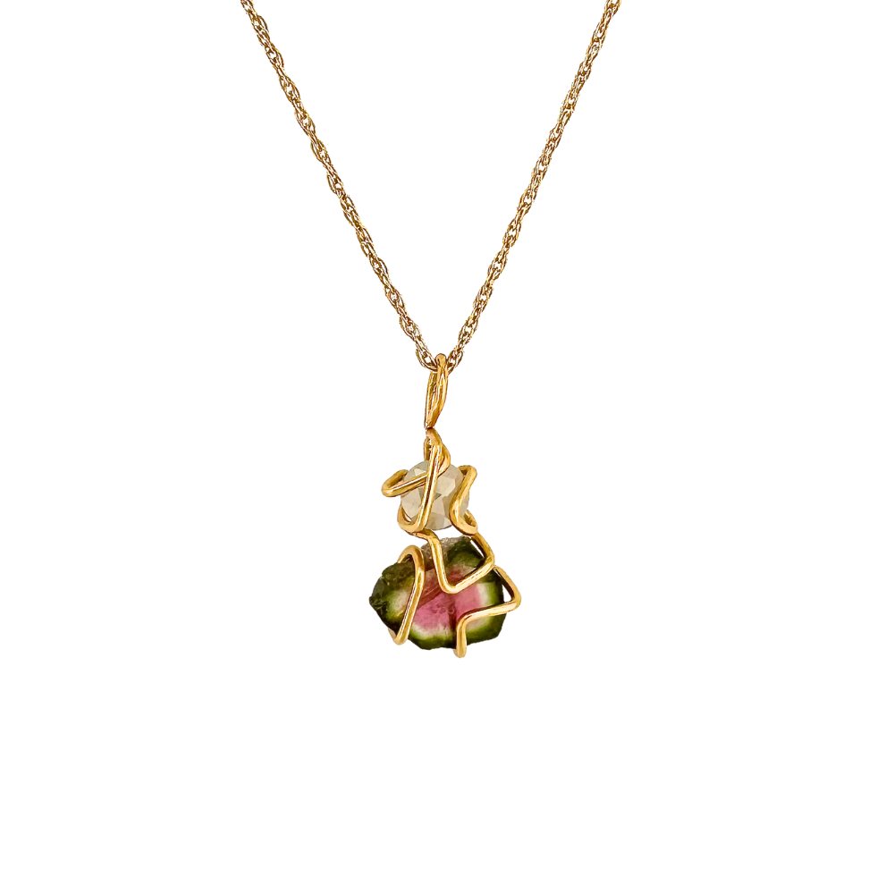 watermelon tourmaline crystal slice, grey diamond, 18k gold