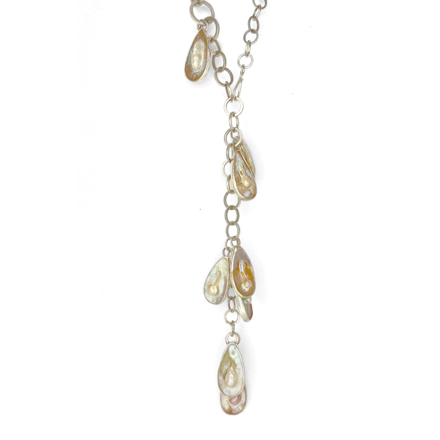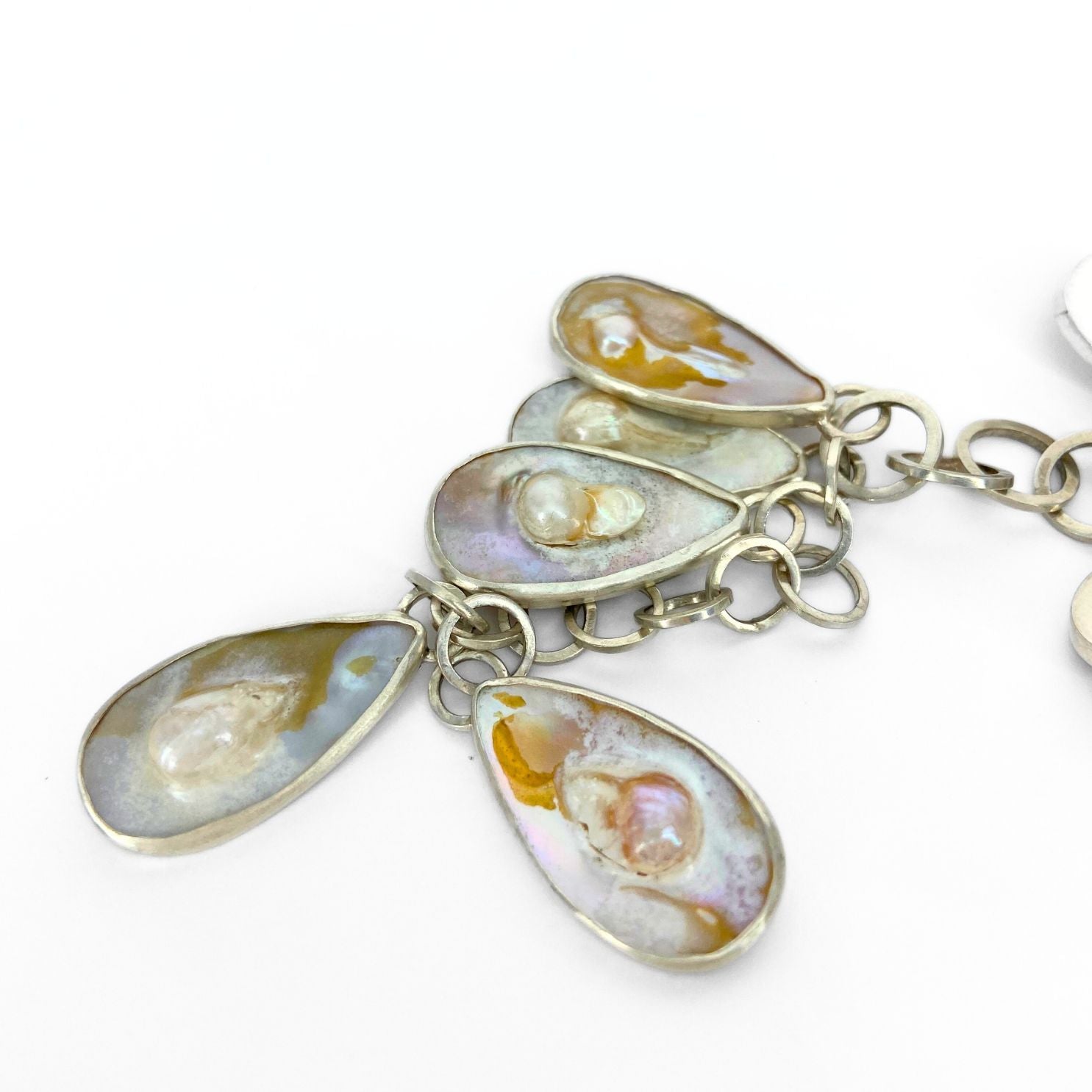 Sterling silver and 14kt gold necklace with teardrop blister pearls and handmade chain