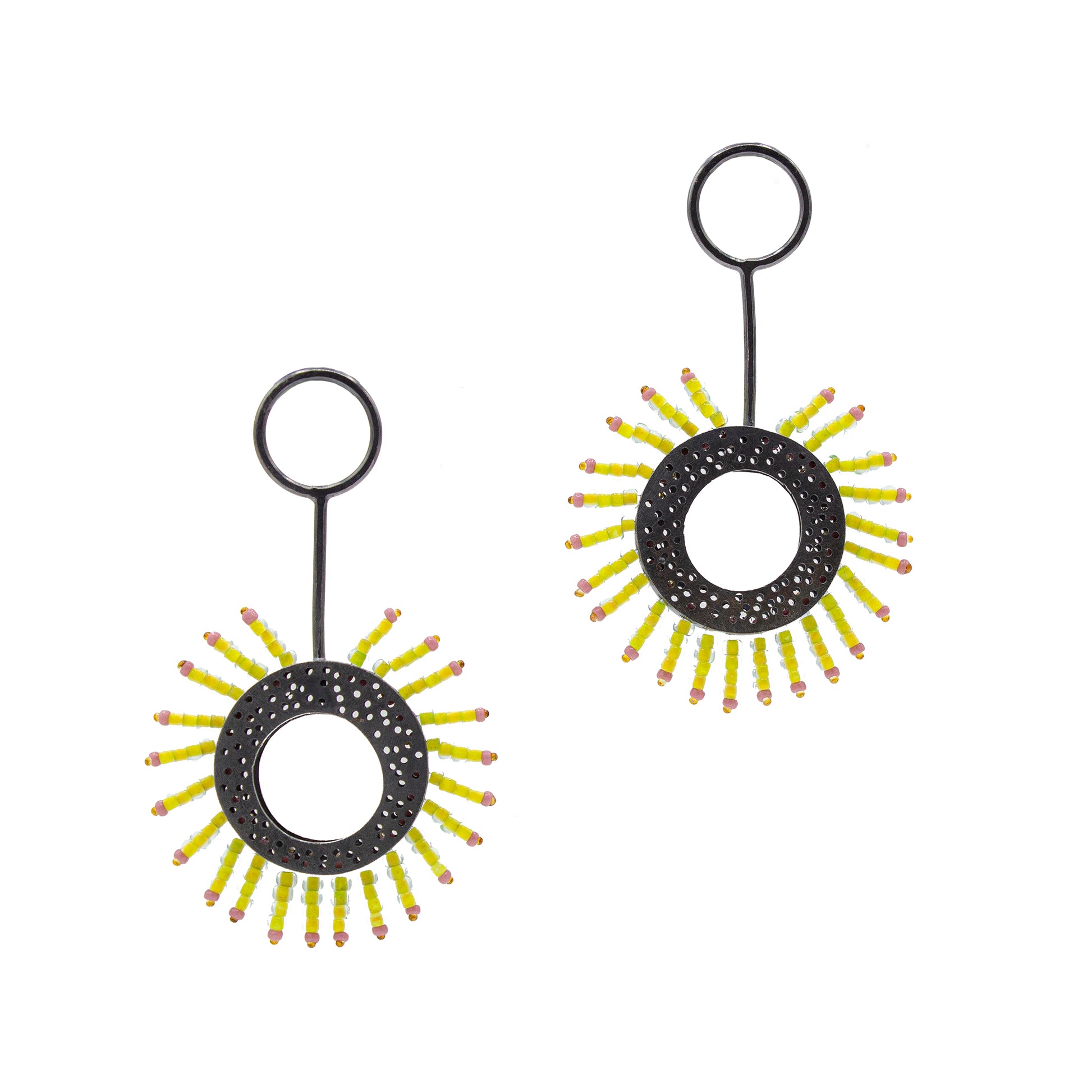 Silver with a black patina using metallic purple and orange beads, securely attached with monofilament.