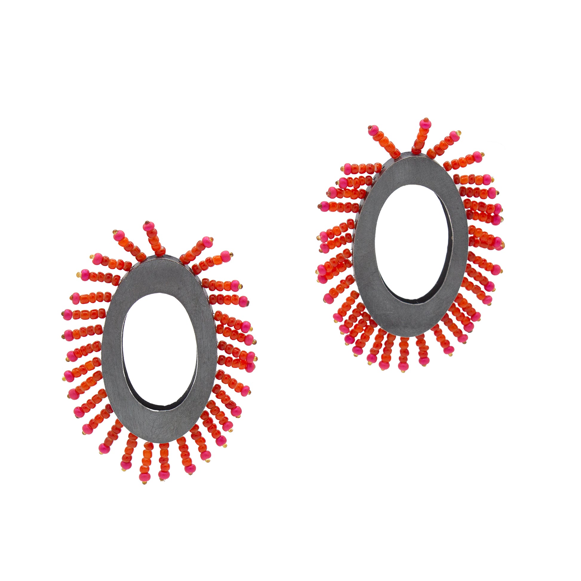 Silver with a black patina using magenta and orange beads, securely attached with monofilament.