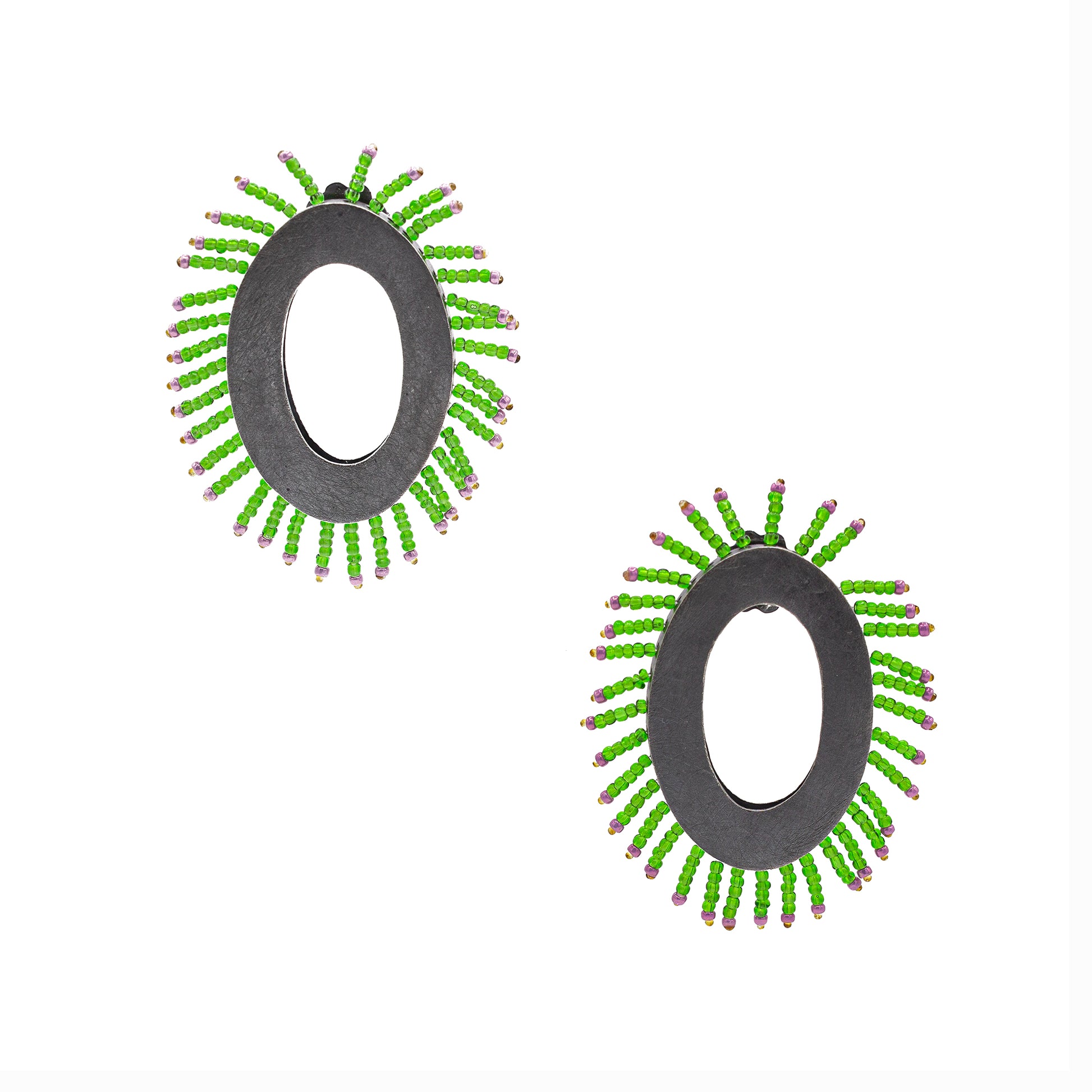 Silver with a black patina using translucent green and pink beads, securely attached with monofilament.
