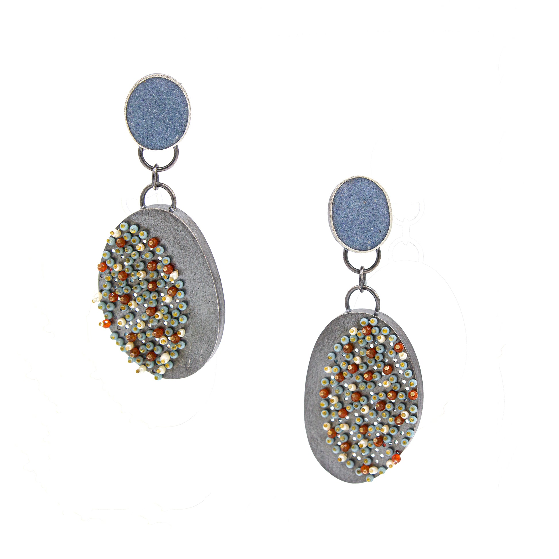 Silver with a black patina using resin, enamel, and white, orange, and blue beads, securely attached with monofilament.