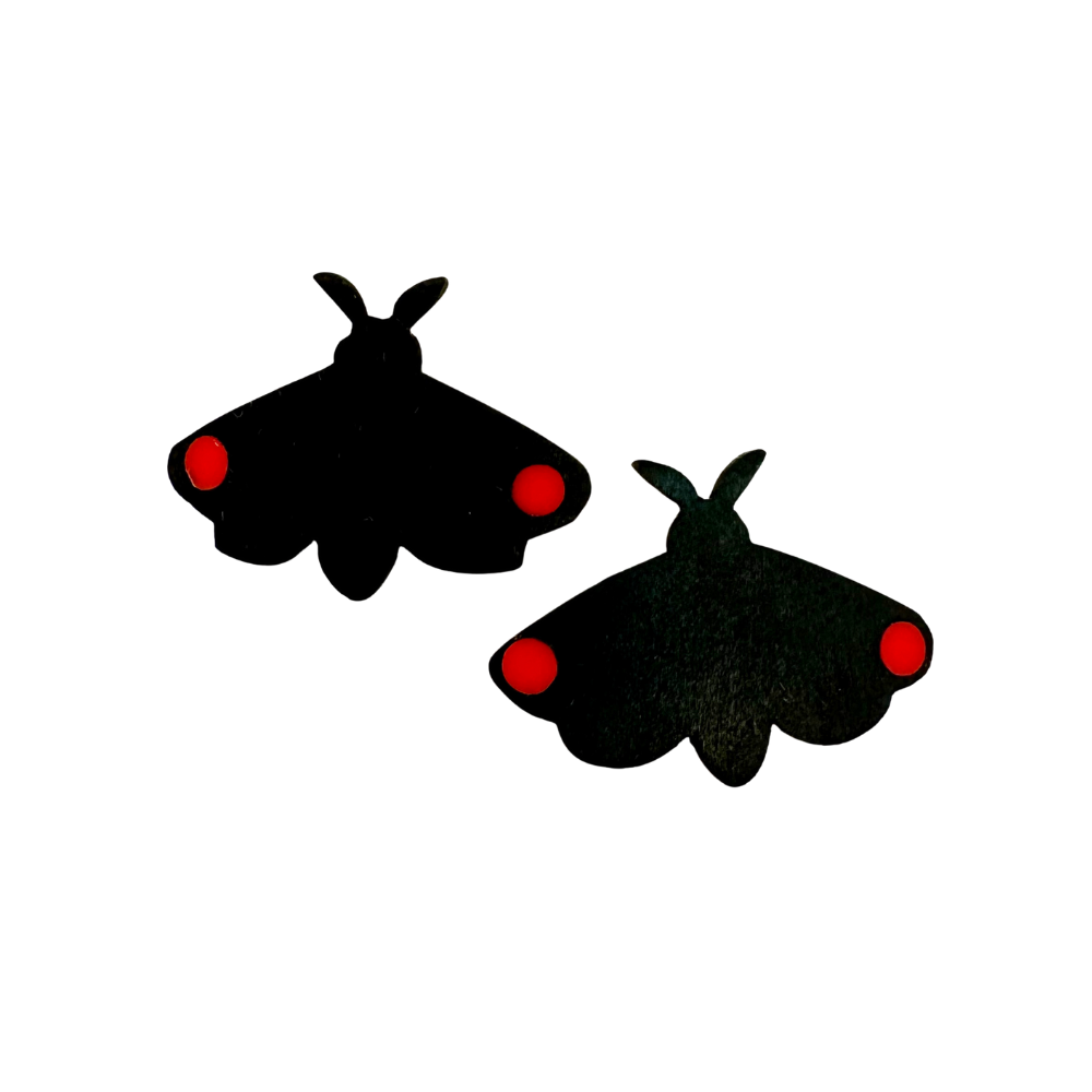 iron/ coloured plastik, oxidized silver ear pins and silver butterfly clutch