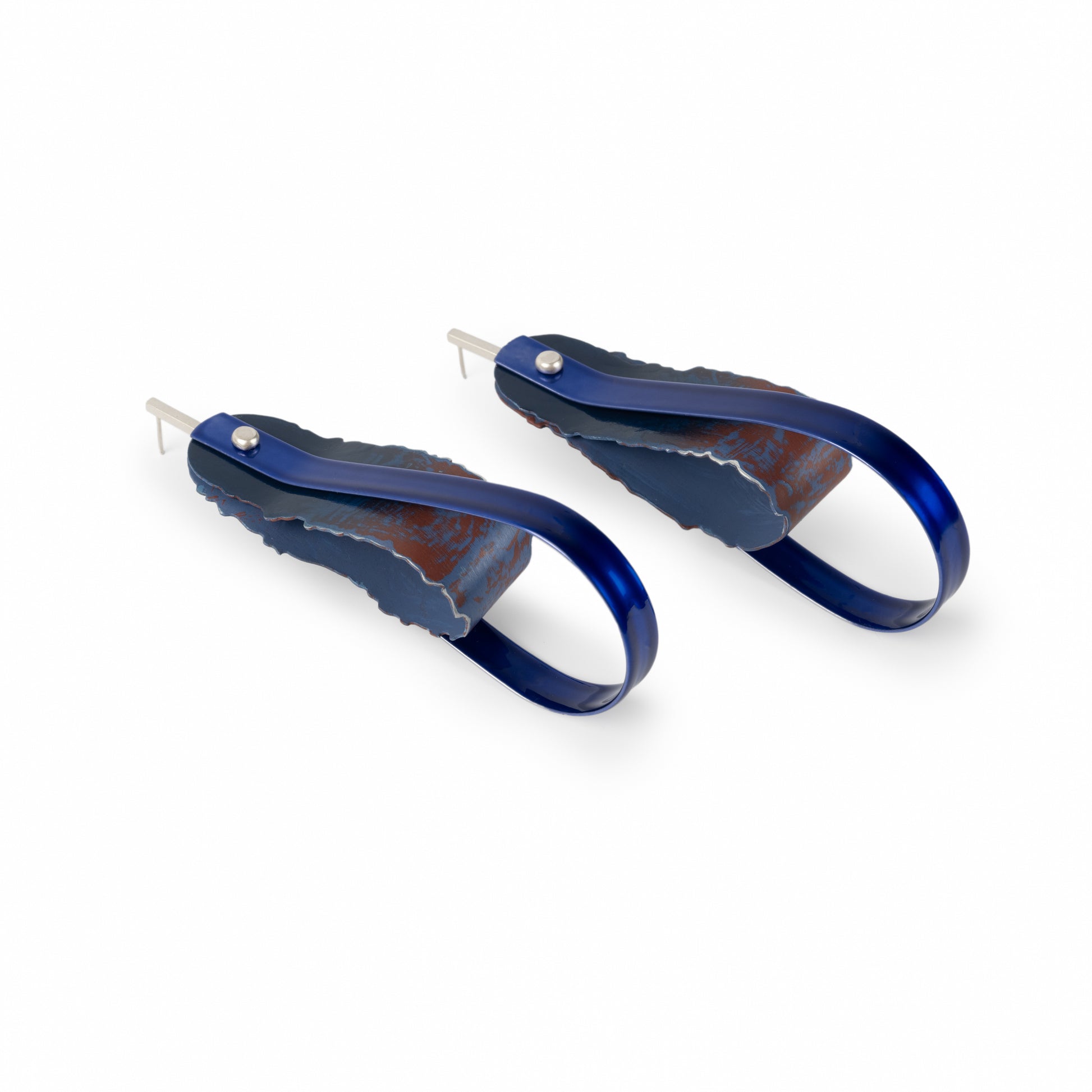 These earrings are shaped to resemble ribbons and strips of torn paper, translated into sheet metal and finished with powder coat and the durable enamel paints I used to paint figurines in my childhood. Ribbons remind me of the time I spent with my mother as a child, playing with her boxes of fabric scraps and ribbons, playfully reinventing discards and leftovers as useful and desirable objects to wear. Cut from thin, light strips of aluminum, my “ribbons” become surfaces to paint and fuse color onto; canvases that loop, bend and interact with each other as they drape off the body. I often use small works, like these earrings, to experiment with color for larger or more complex pieces. As such, they are joyful to make, free from the pressure of having to meet high expectations and indulging my intuitive creativity. In making them I can embrace the child in me, the feminine and the flamboyant. This work is made for those who find their power through these things.