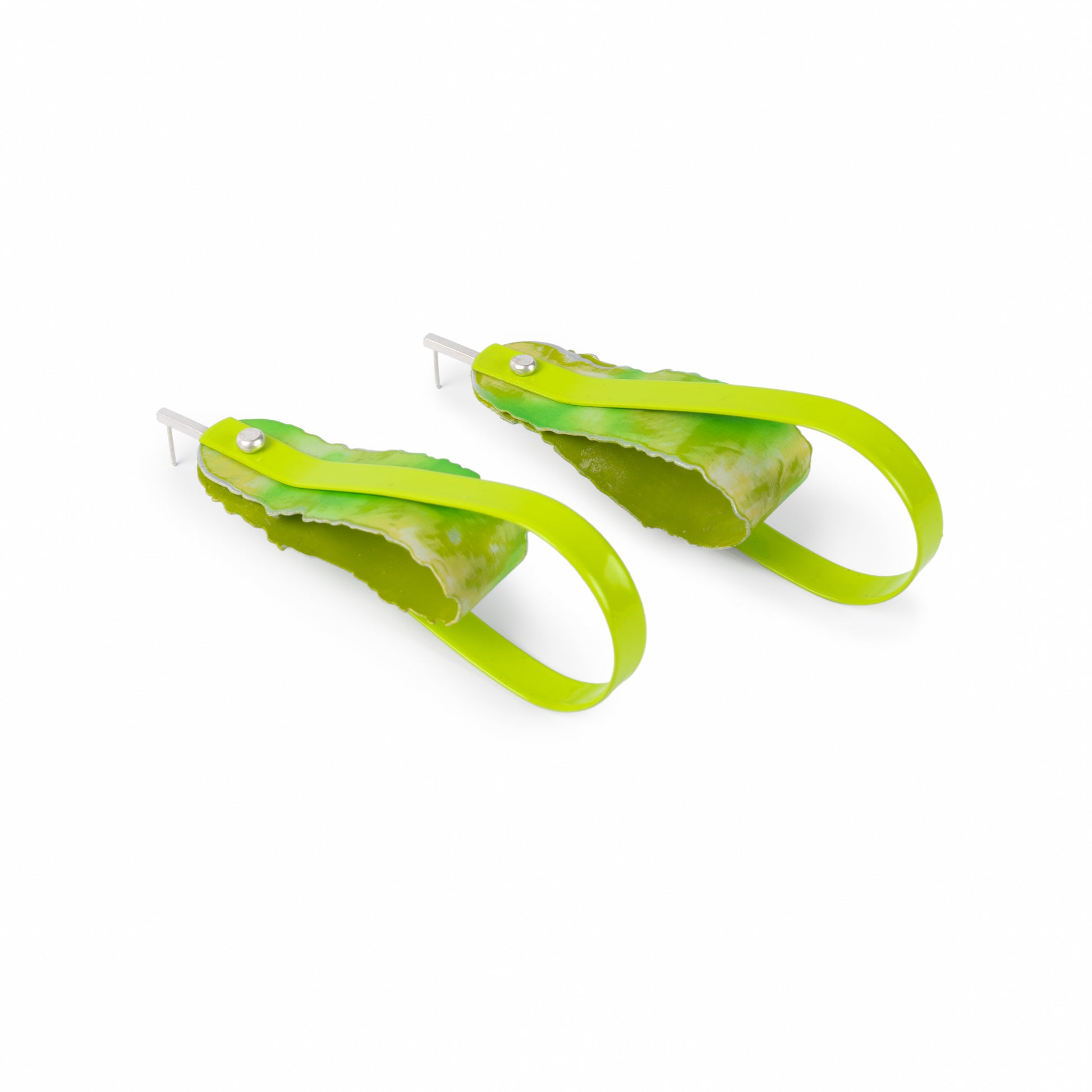 These earrings are shaped to resemble ribbons and strips of torn paper, translated into sheet metal and finished with powder coat and the durable enamel paints I used to paint figurines in my childhood. Ribbons remind me of the time I spent with my mother as a child, playing with her boxes of fabric scraps and ribbons, playfully reinventing discards and leftovers as useful and desirable objects to wear. Cut from thin, light strips of aluminum, my “ribbons” become surfaces to paint and fuse color onto; canvases that loop, bend and interact with each other as they drape off the body. I often use small works, like these earrings, to experiment with color for larger or more complex pieces. As such, they are joyful to make, free from the pressure of having to meet high expectations and indulging my intuitive creativity. In making them I can embrace the child in me, the feminine and the flamboyant. This work is made for those who find their power through these things.