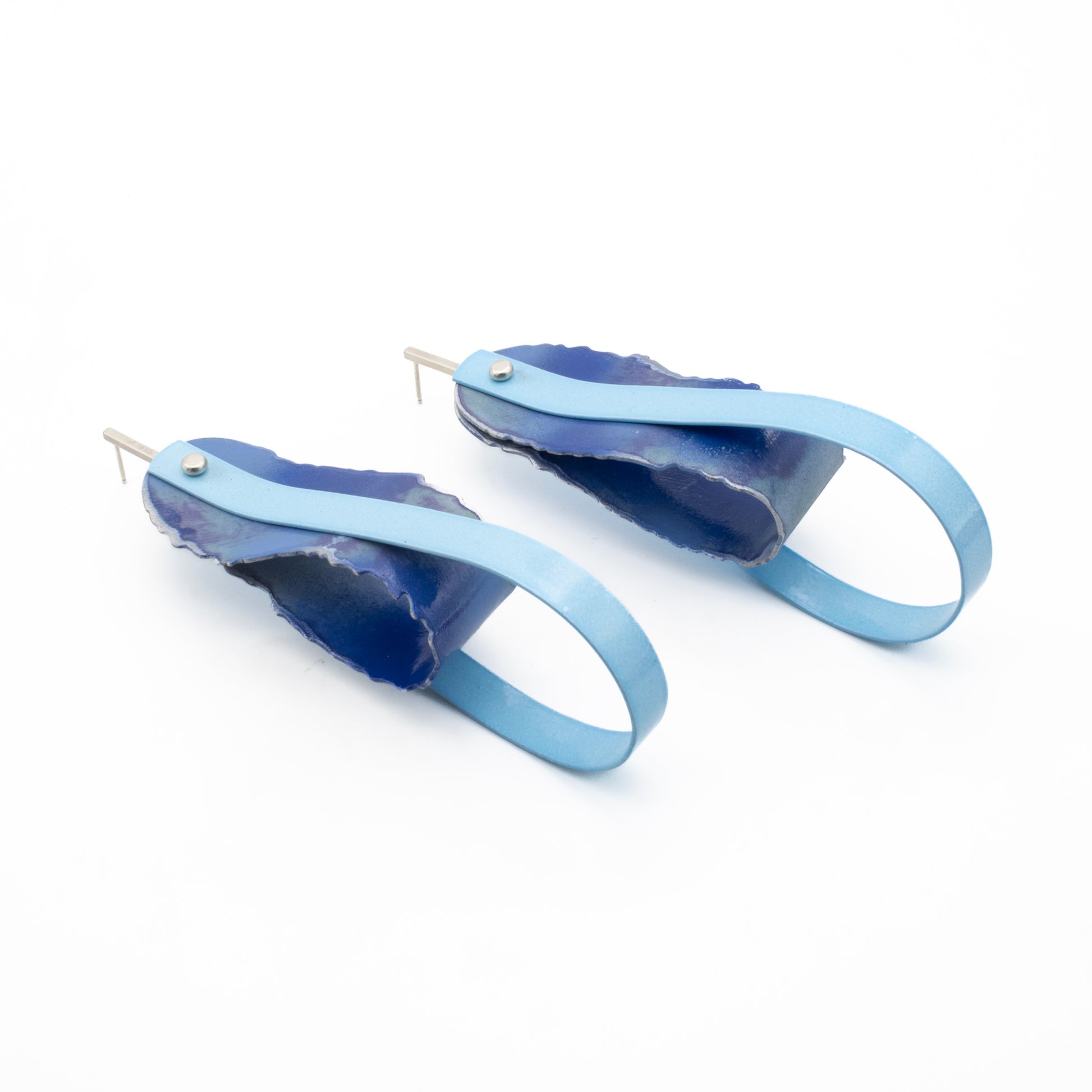 These earrings are shaped to resemble ribbons and strips of torn paper, translated into sheet metal and finished with powder coat and the durable enamel paints I used to paint figurines in my childhood. Ribbons remind me of the time I spent with my mother as a child, playing with her boxes of fabric scraps and ribbons, playfully reinventing discards and leftovers as useful and desirable objects to wear. Cut from thin, light strips of aluminum, my “ribbons” become surfaces to paint and fuse color onto; canvases that loop, bend and interact with each other as they drape off the body. I often use small works, like these earrings, to experiment with color for larger or more complex pieces. As such, they are joyful to make, free from the pressure of having to meet high expectations and indulging my intuitive creativity. In making them I can embrace the child in me, the feminine and the flamboyant. This work is made for those who find their power through these things.