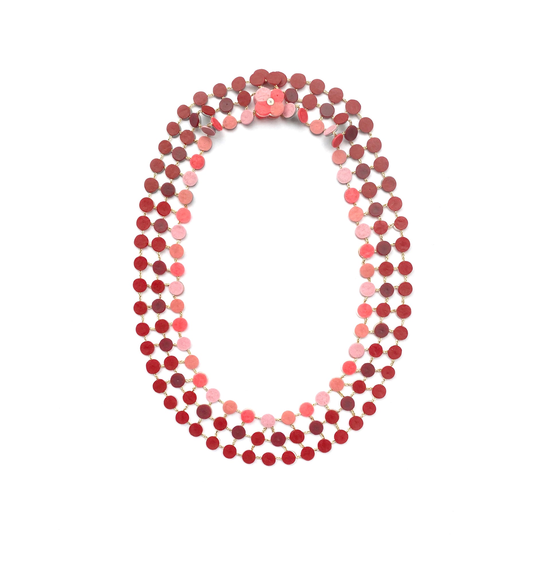 plastic (red/pearl/grey), textile thread, velcro